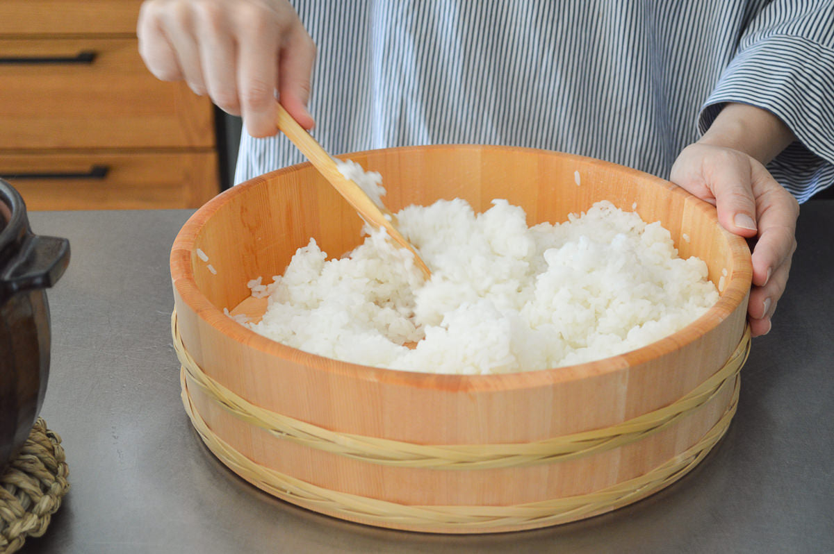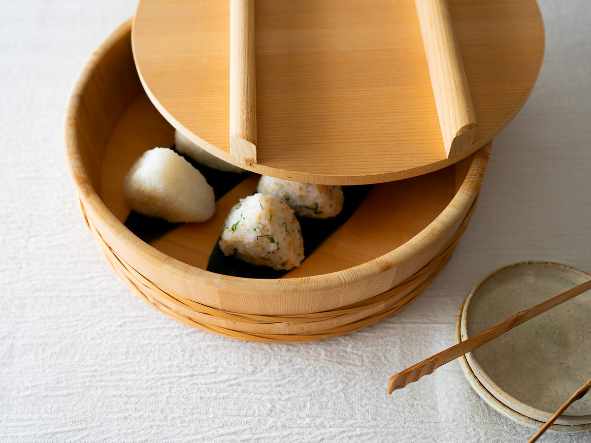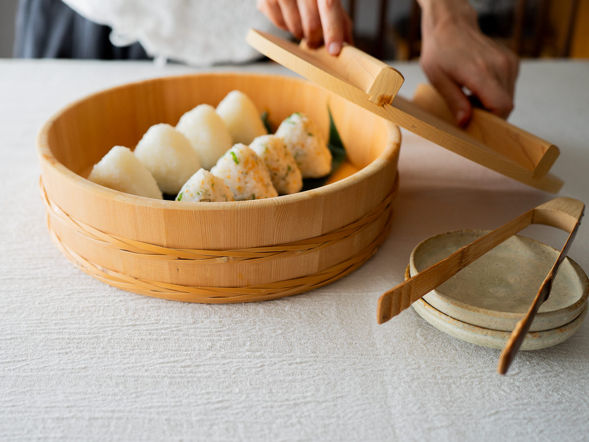 シンプルにおにぎりを作って、こちらの飯台に並べておき、蓋をして、召し上がるまで保管しておくのにもいいです。