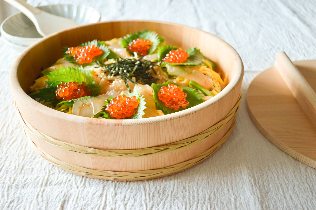 こちらの飯台に華やかにばら寿司を盛り付けてみました。