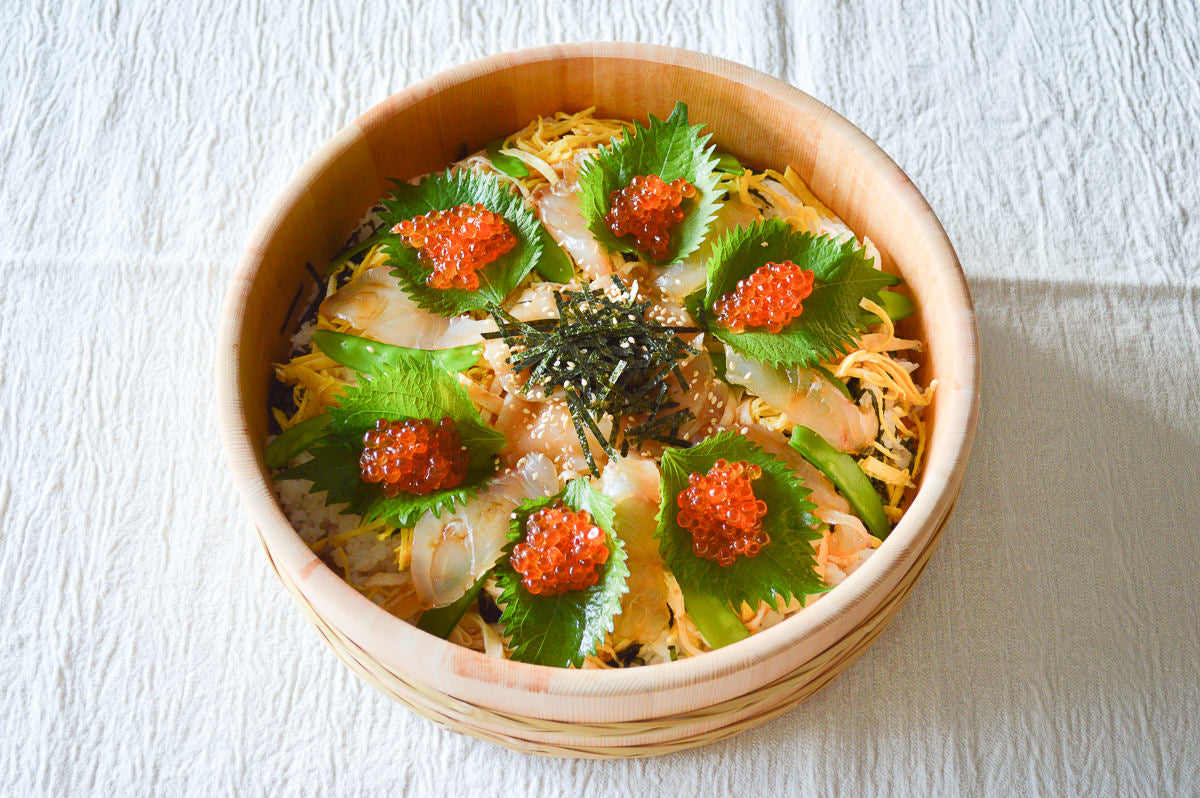 こちらの飯台に華やかにばら寿司を盛り付けてみました。