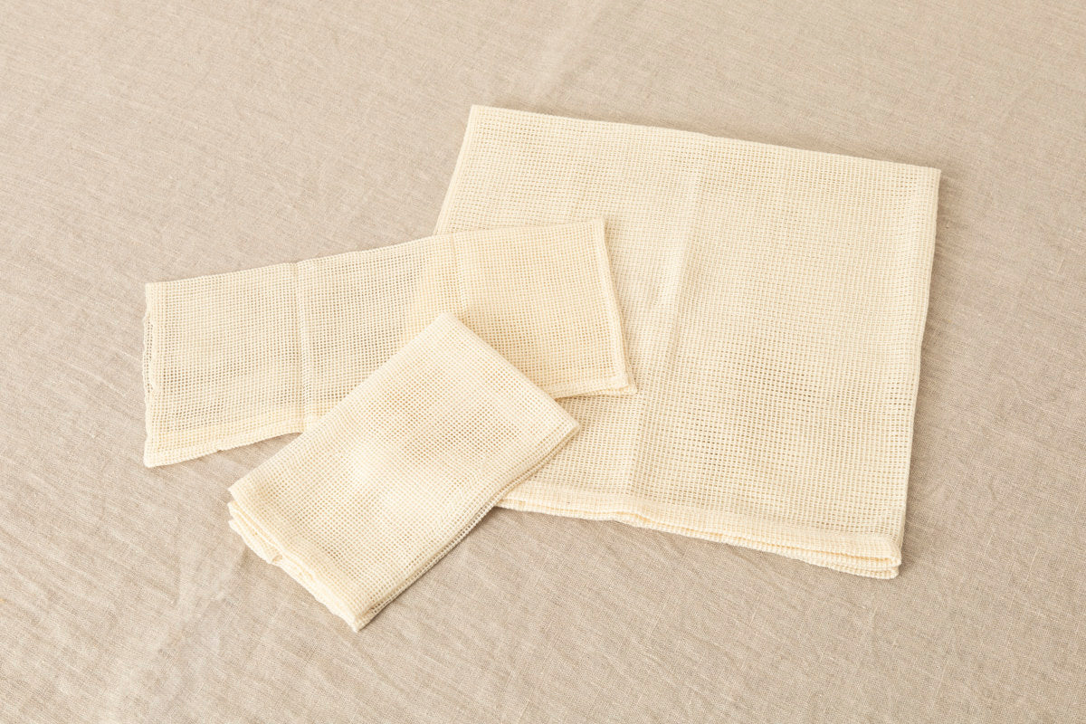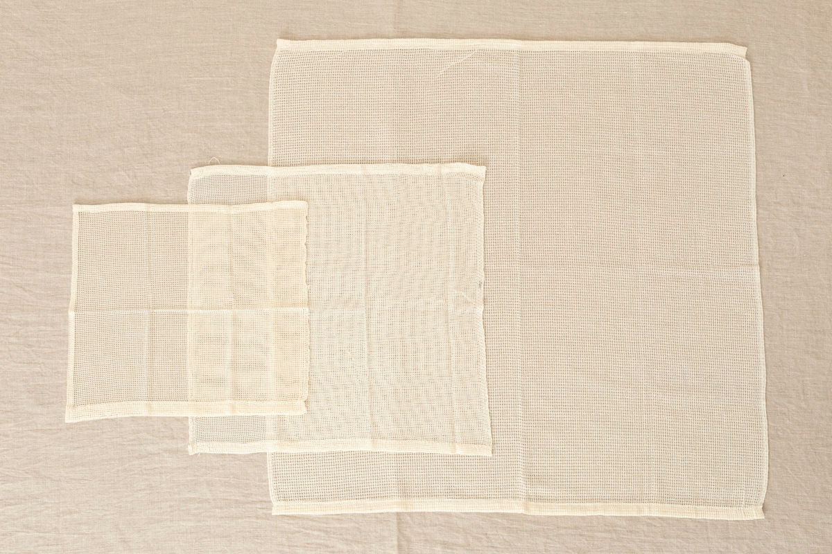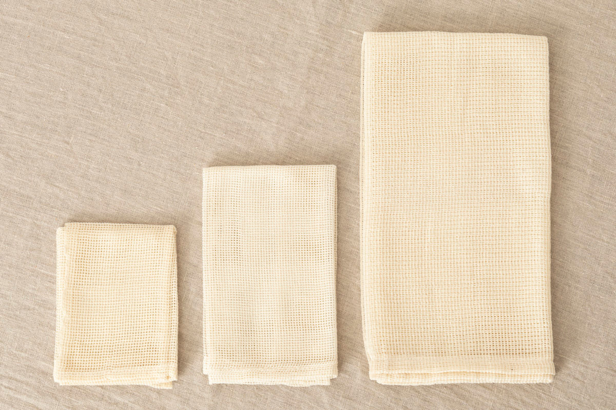 綿で織られた蒸し布をS、M、Lの3サイズでご紹介いたします。