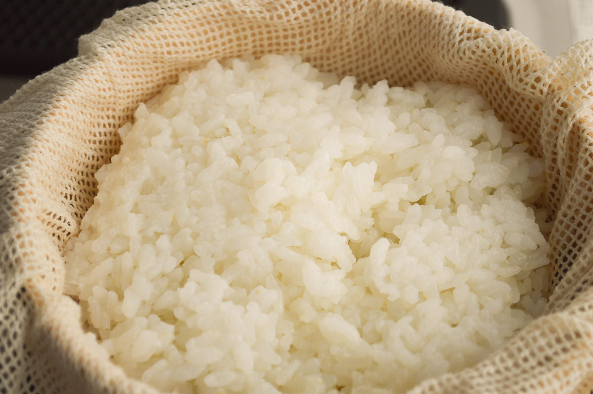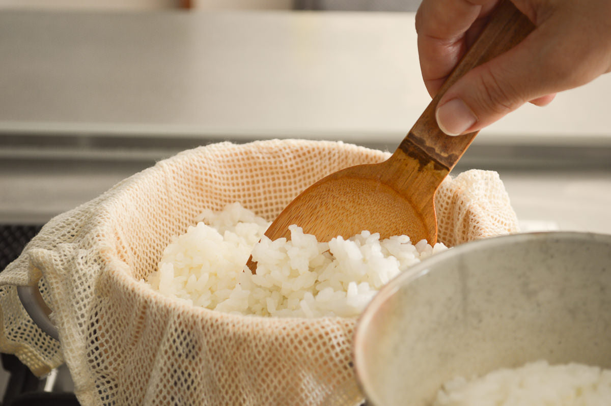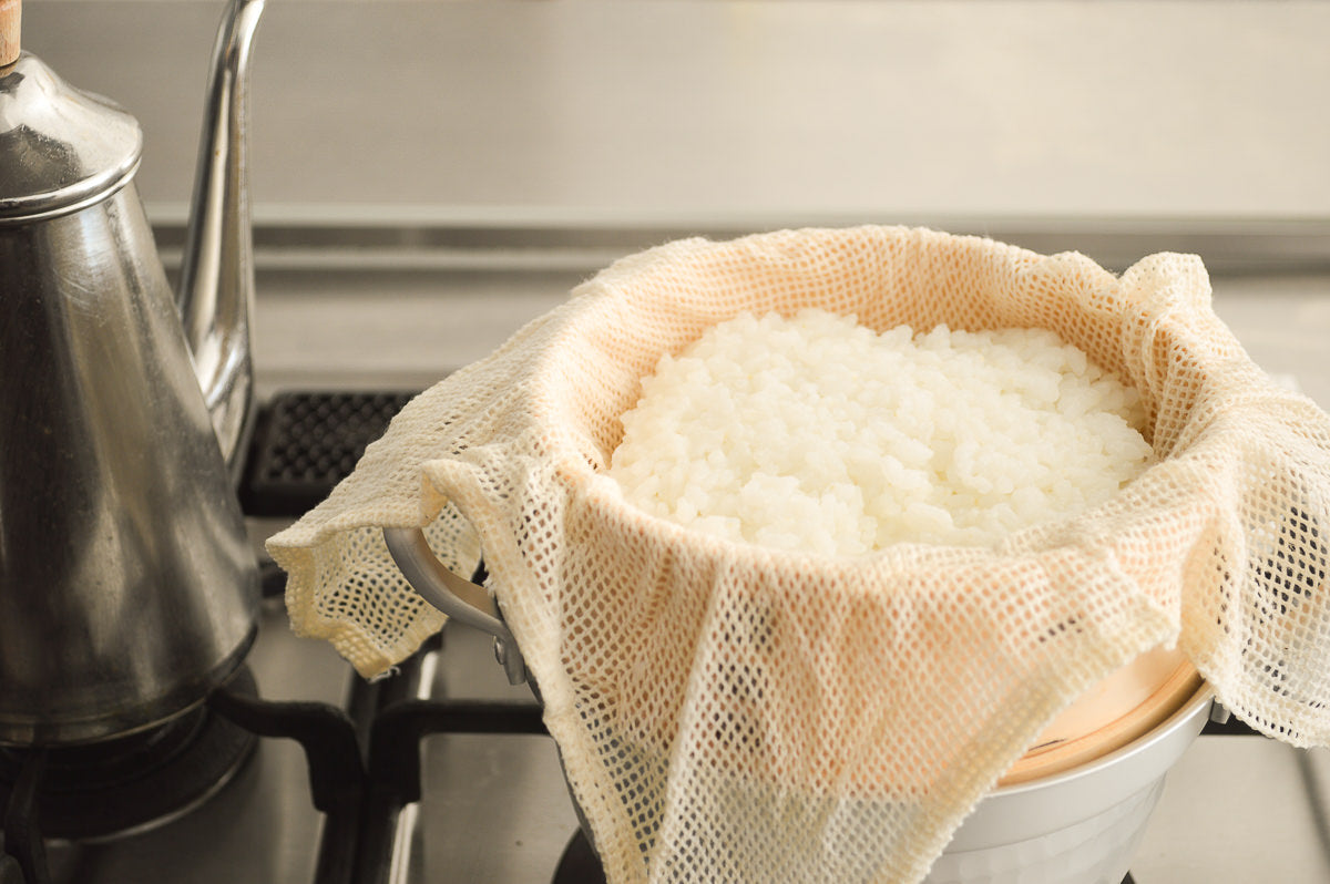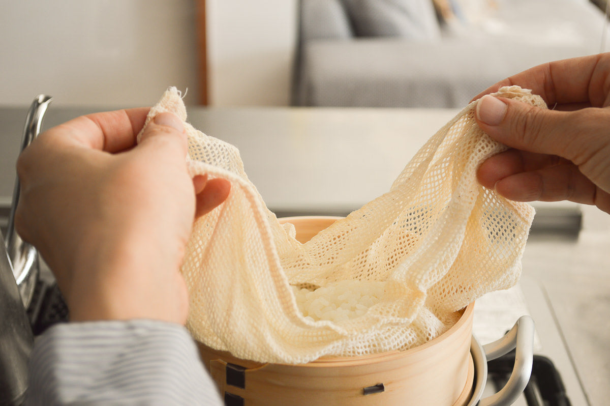 蒸し布を使うことで、お米のようにつぶの細かいものを蒸してから引き上げたり、