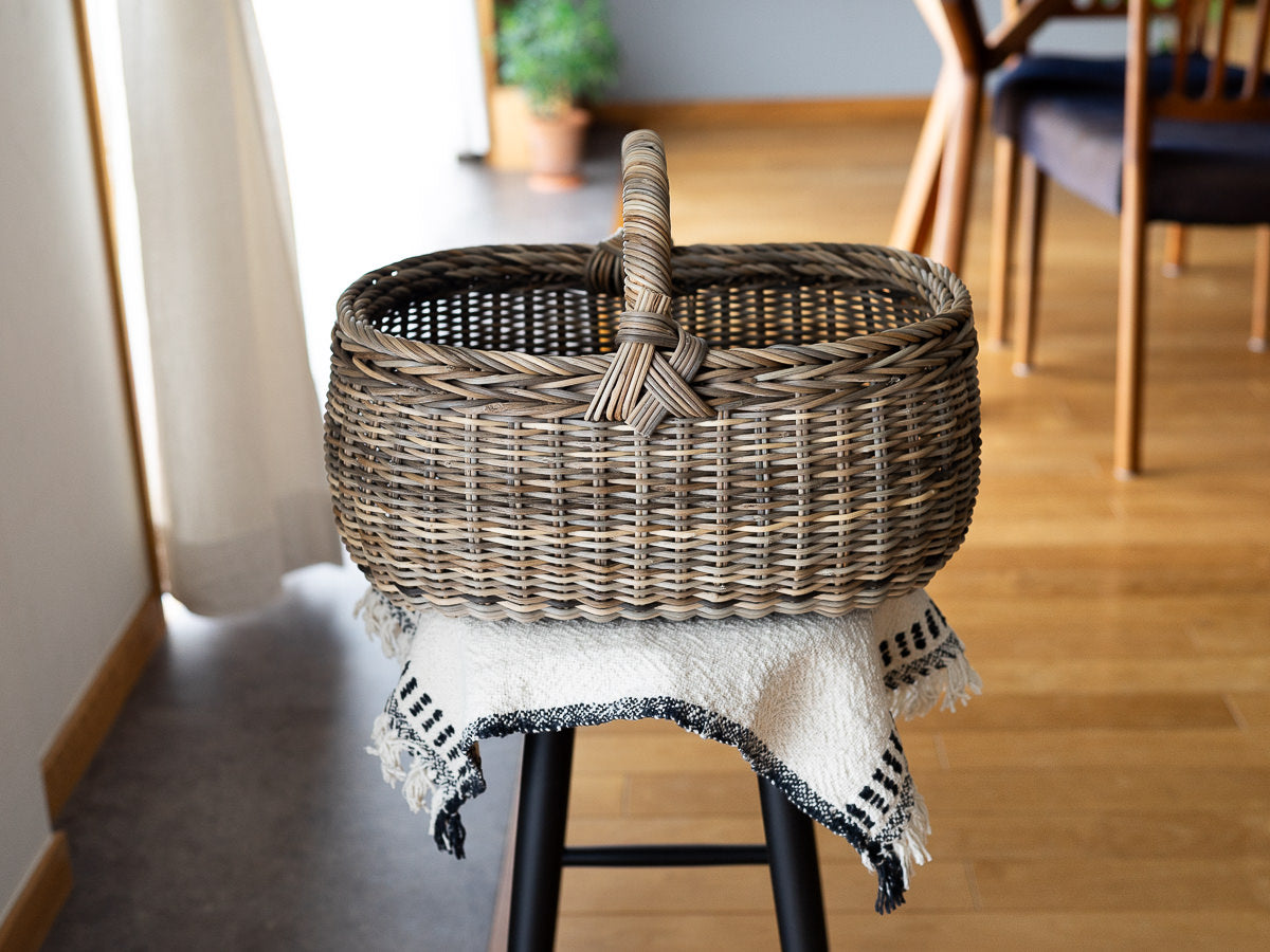 This basket is made from peeled Akebi vine, prepared by soaking in hot spring and river water.