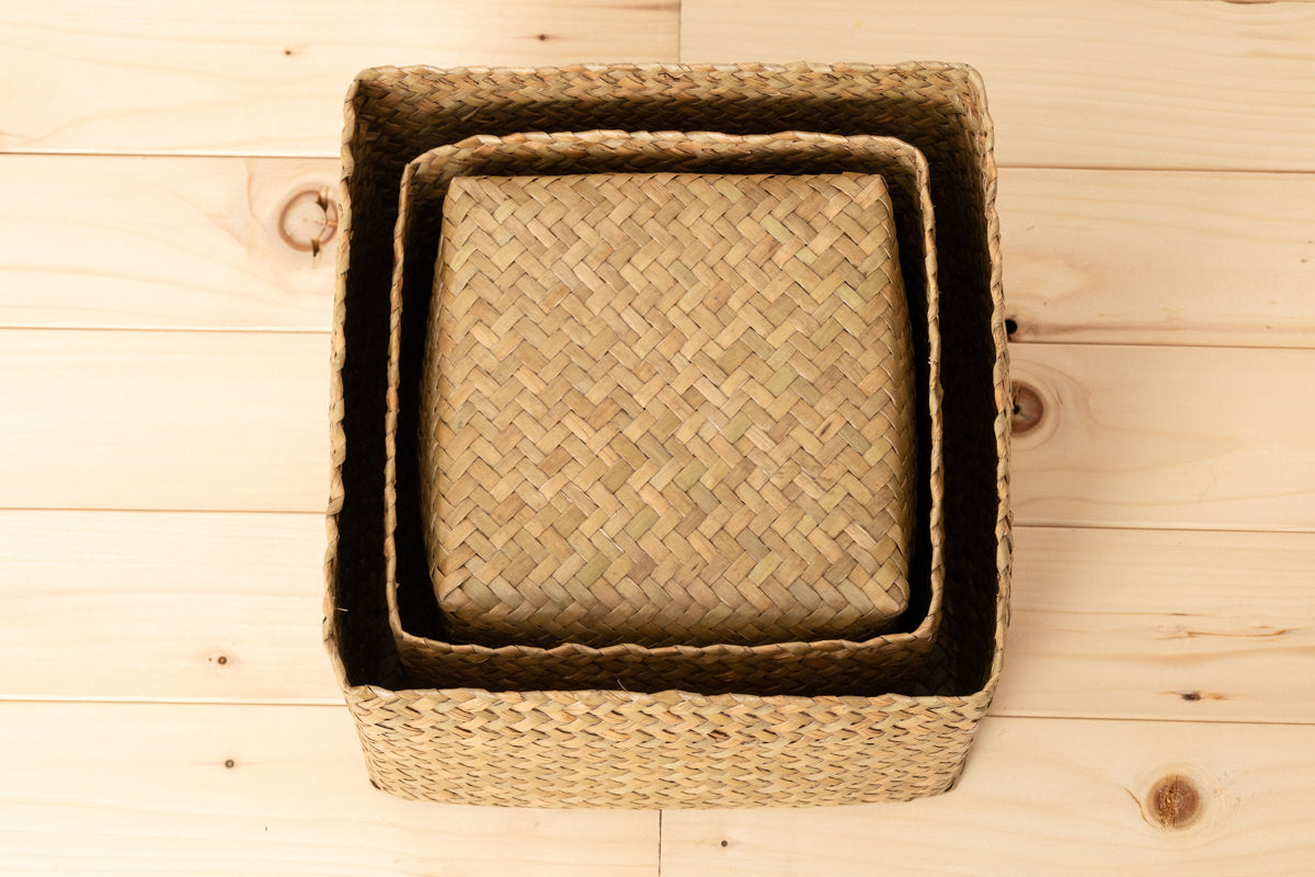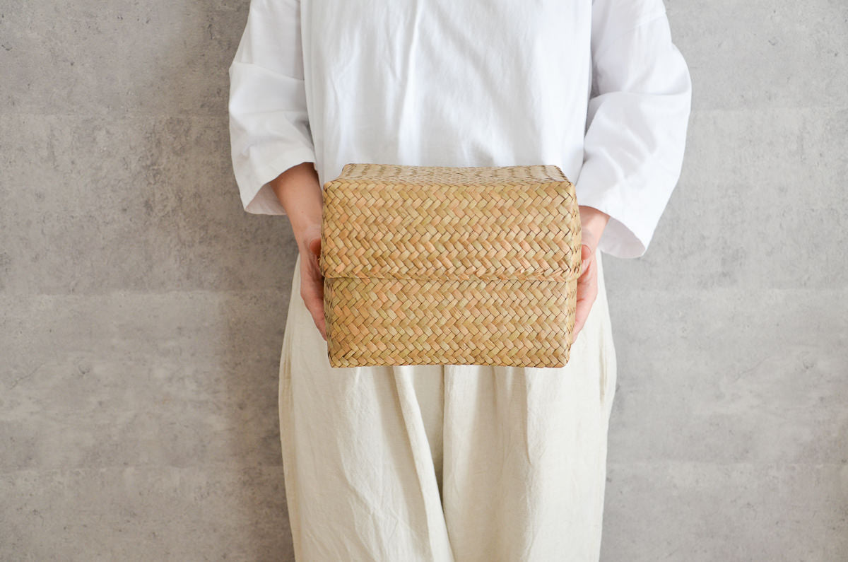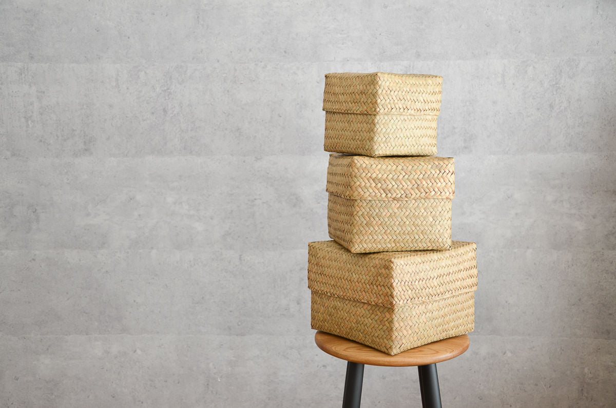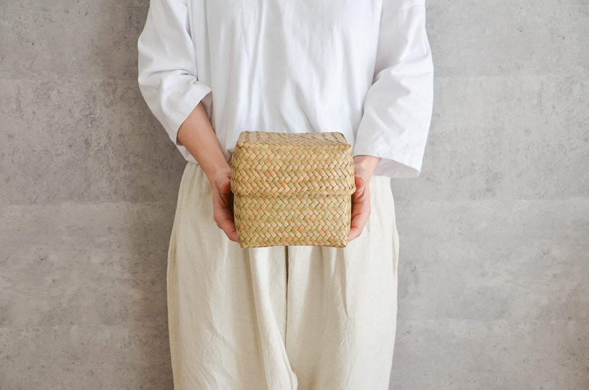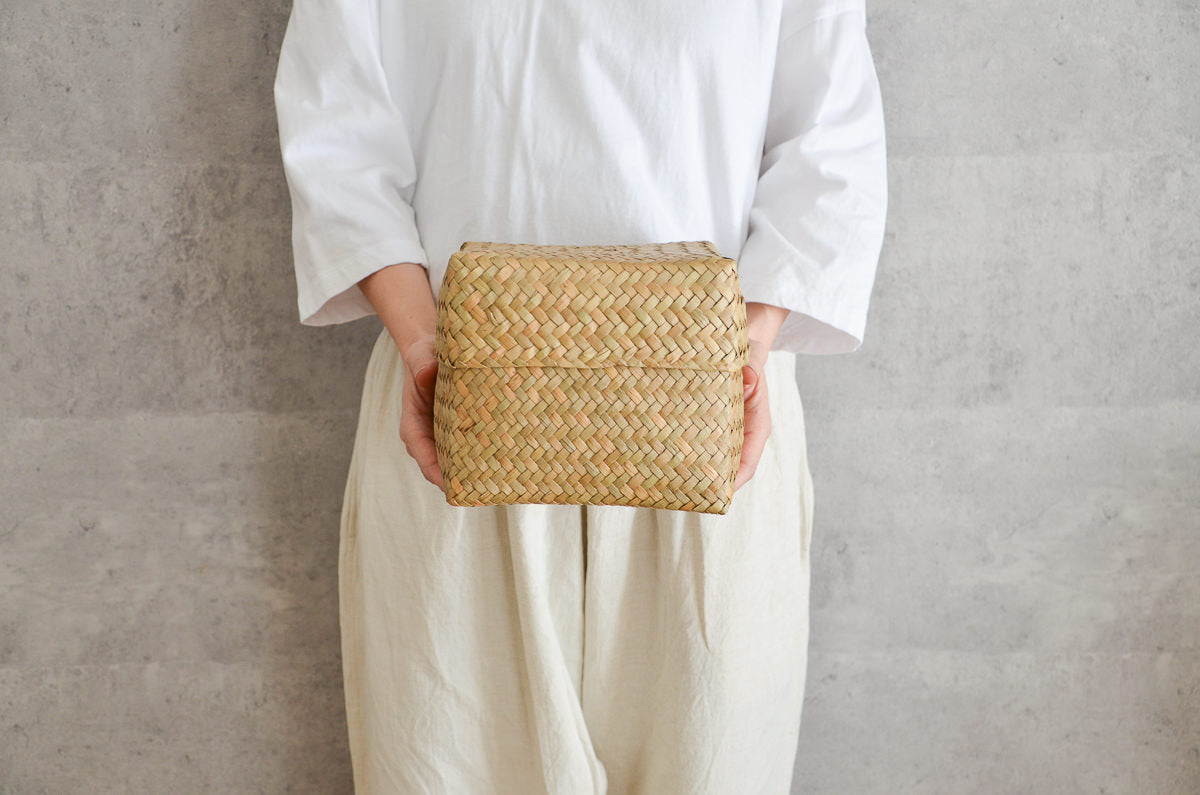 On this page, we introduce three sizes (S, M, and L) of compact, cube-shaped organizing baskets made from “Krajood” with lids.
